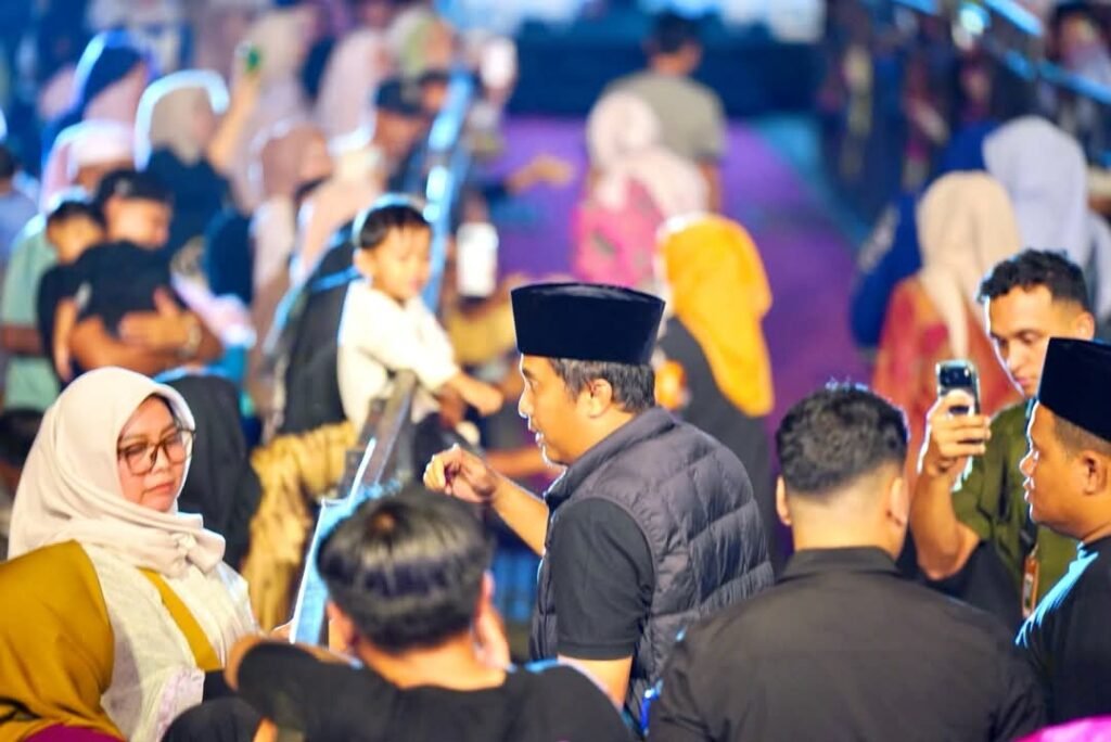 Annisa dan Leli berdiri anggun, berdampingan bersama Haddad Alwi, ikut bershalawat dan menyatu dengan ribuan jamaah yang memadati area acara. Momen tersebut menjadi simbol kebersamaan pemimpin dan rakyat dalam doa serta harapan.