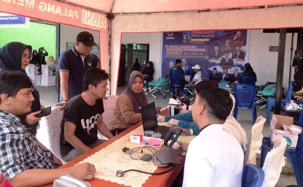Di Kota Solok, Partai Nasdem setempat, melaksanakan aksi donor darah dan pemeriksaan kesehatan gratis, Selasa (28/10/25) di di kantor Nasdem, jalan Dt. Perpatih nan sabatang, Kelurahan Simpang Rumbio