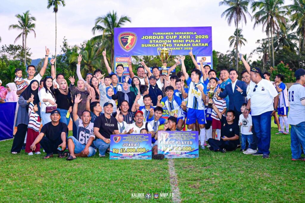Beritanda.net – Tim MMP FC asal Singkarak, Kabupaten Solok berhasil menunjukkan kelasnya sebagai Juara Turnamen Sepakbola Tarkam legendaris di Sumatera Barat, Jordus Cup edisi 22 tahun 2026, dengan menggulingkan Duo Swarna FC asal Dharmasraya dengan skort 3-1.