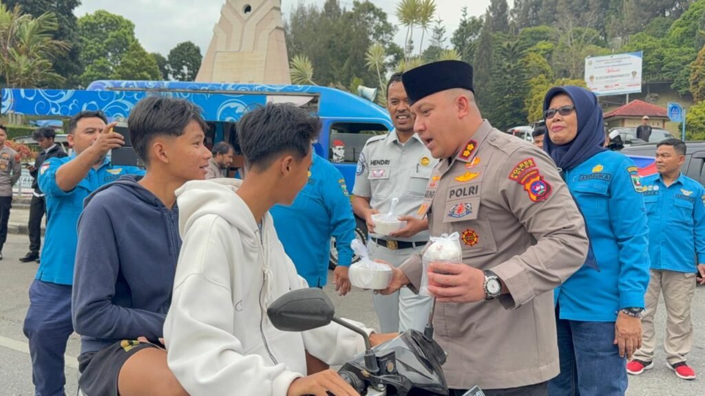 Beritanda.net – Peduli terhadap pengguna jalan raya yang tengah menjalani ibadah puasa Ramadan, jajaran Polres Solok gelar aksi pembagian takjil gabungan bersama Dispenda Kabupaten Solok dan Bank Nagari Cabang Solok, Rabu (4/3/2026) di Arosuka.