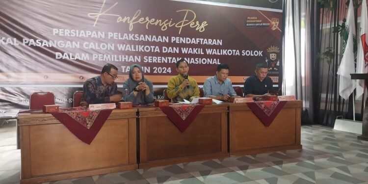 Beritanda – Menjelang dilaksanakan penerimaan Pendaftaran Pasangan Calon Wali Kota (Cawako) dan Calon Wakil Wali Kota (Cawawako) Kota Solok 2024, Komisi Pemilihan Umum (KPU) Kota Solok menggelar Jumpar Pers guna memaparkan tahapan dan mekanisme pendaftaran Calon Kepala Daerah (Cakada) kepada wartawan, Senin (26/08/24), di Aula KPU setempat.
