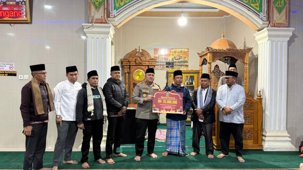 Menandai kunjungannya, Kapolres AKBP Agung Pranajaya sebagai ketua Tim Ramadhan berkenan menyerahkan bantuan secara simbolia sebesar Rp 25 juta untuk pembangunan masjid Al Aqsha Rimbo Data.