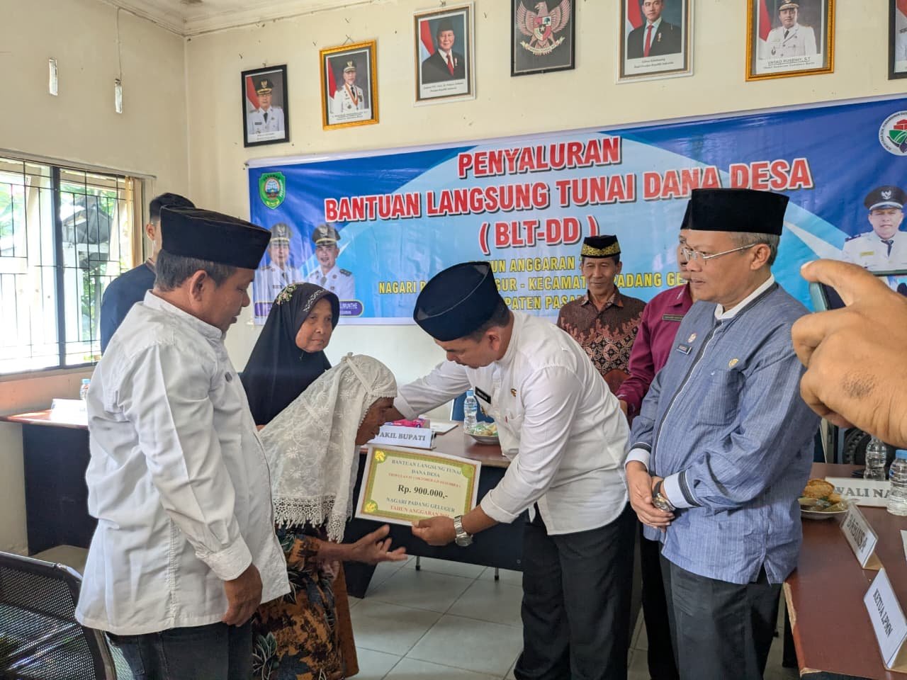 Penyerahan BLT ini dihadiri Kepala Dinas Pemberdayaan Masyarakat Pasaman Hasrizal, Camat Padang Gelugur, Wali Nagari Padang Galugua Syafrial beserta perangkat, Tenaga Pendamping Profesional, Babinsa, Babinkamtibmas, Ketua Lembaga tingkat Nagari dan puluhan penerima manfaat.